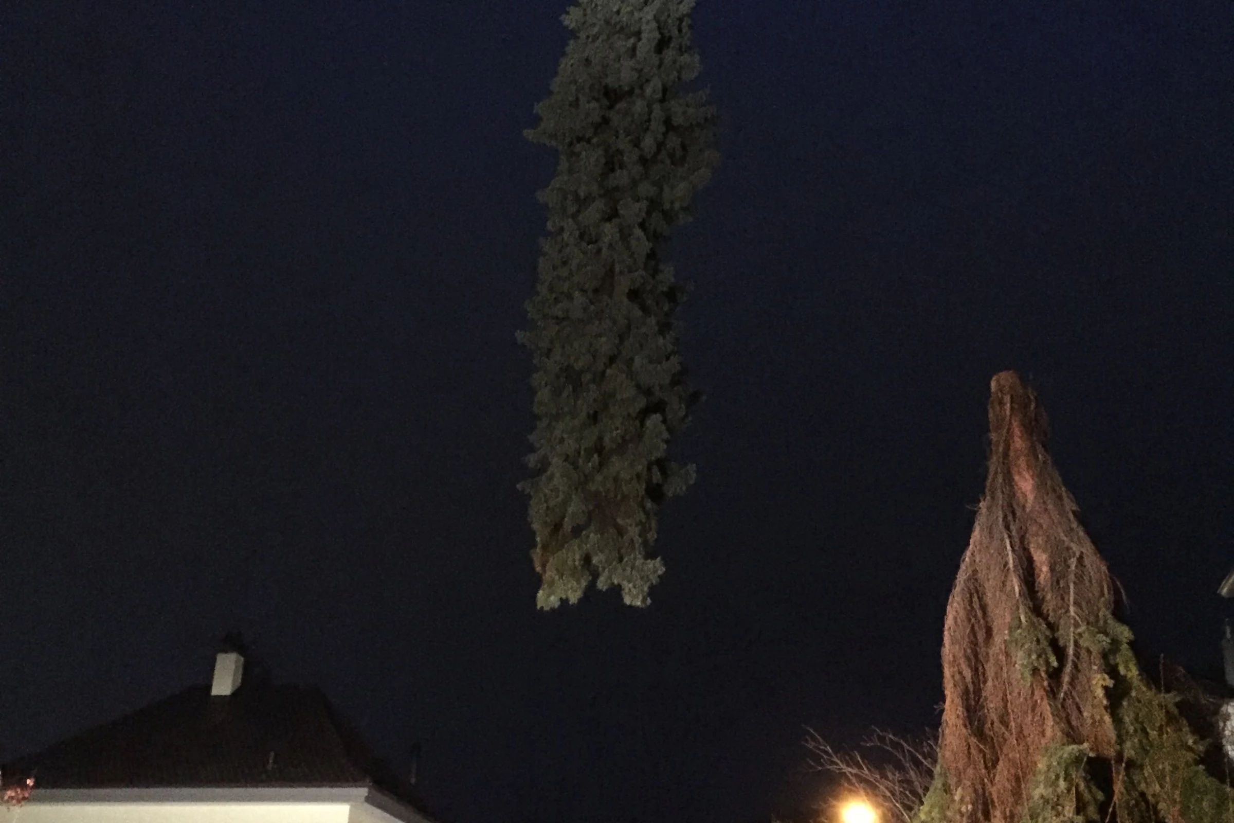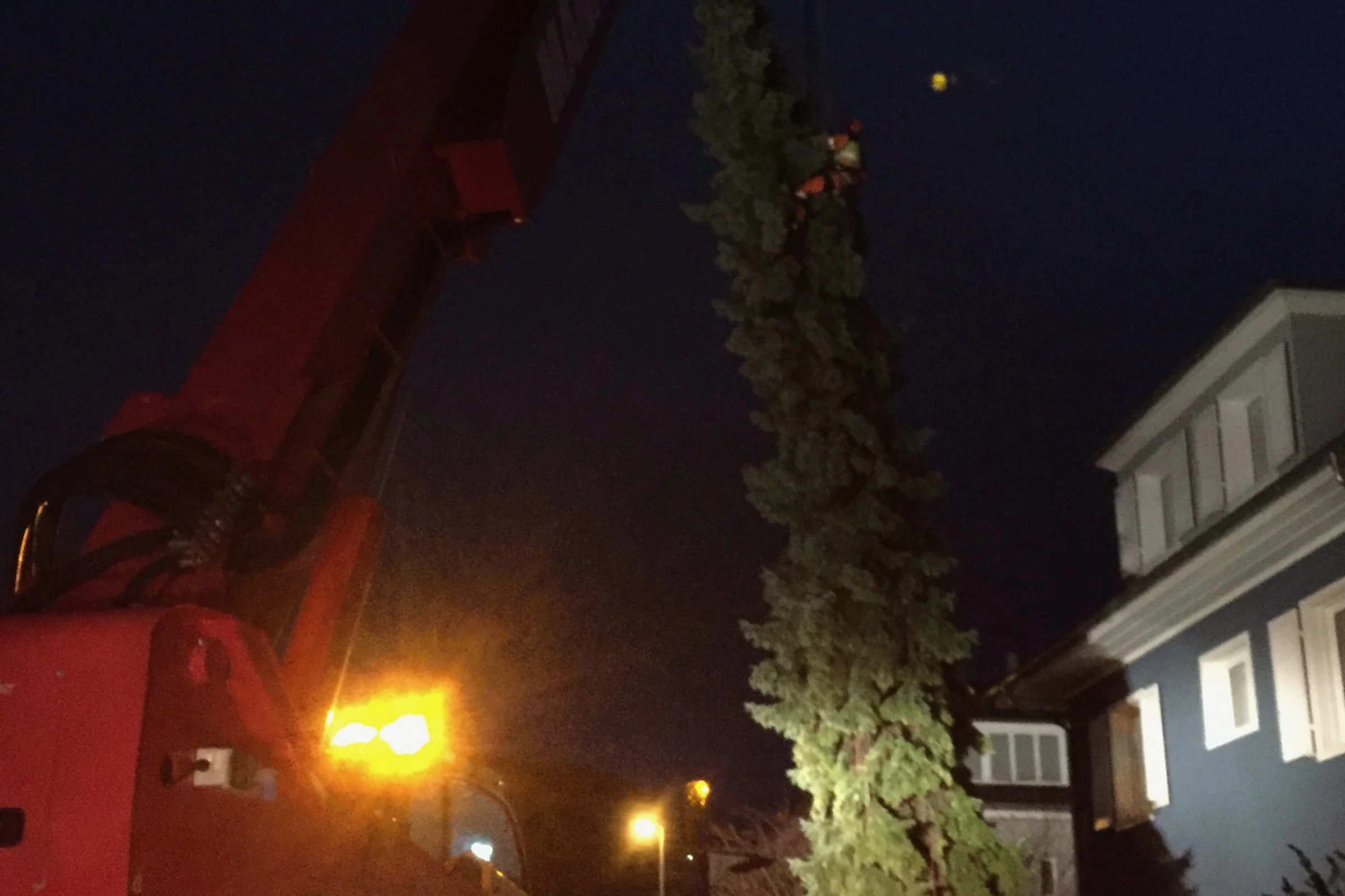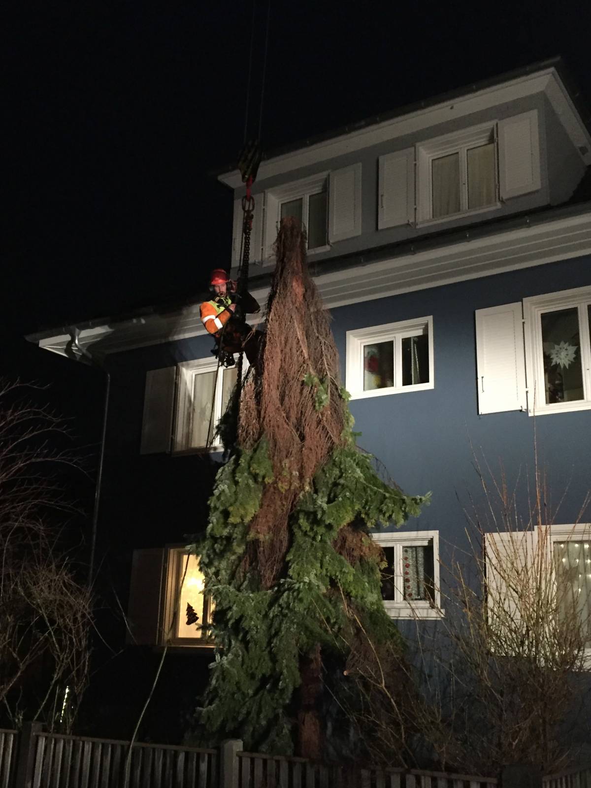 Durch die starken Luftböen und die intensiven Regenfälle in den vergangenen Nächten wurde das Wurzelwerk dieser Fichte teilweise aus dem Boden gerissen. In der Folge hatte der Baum Schieflage. Aus Sicherheitsgründen musste darum diese Pflanze kurzfristig entfernt werden.