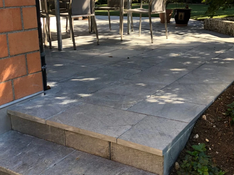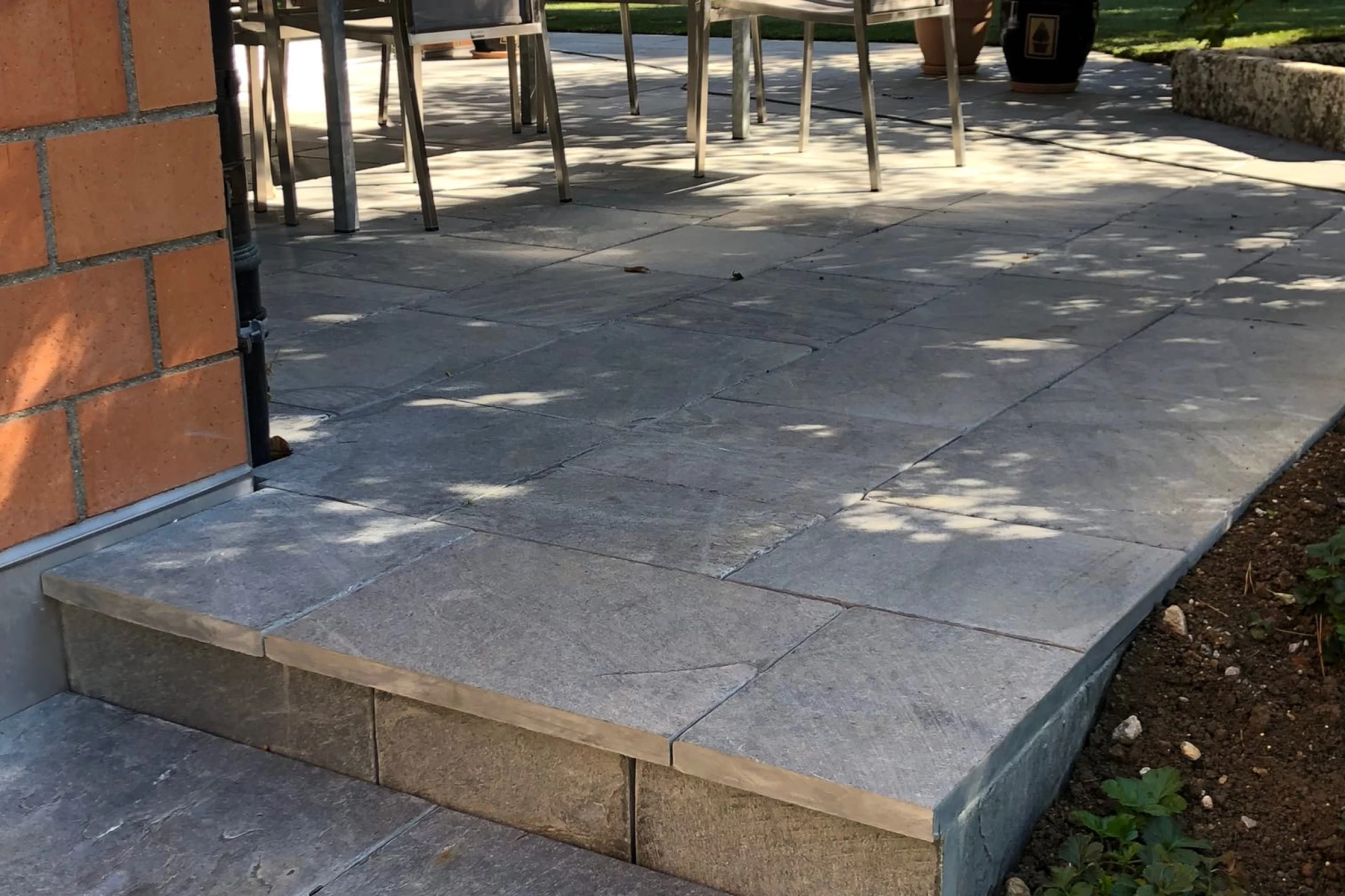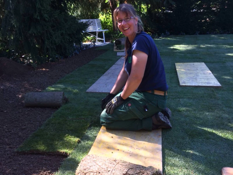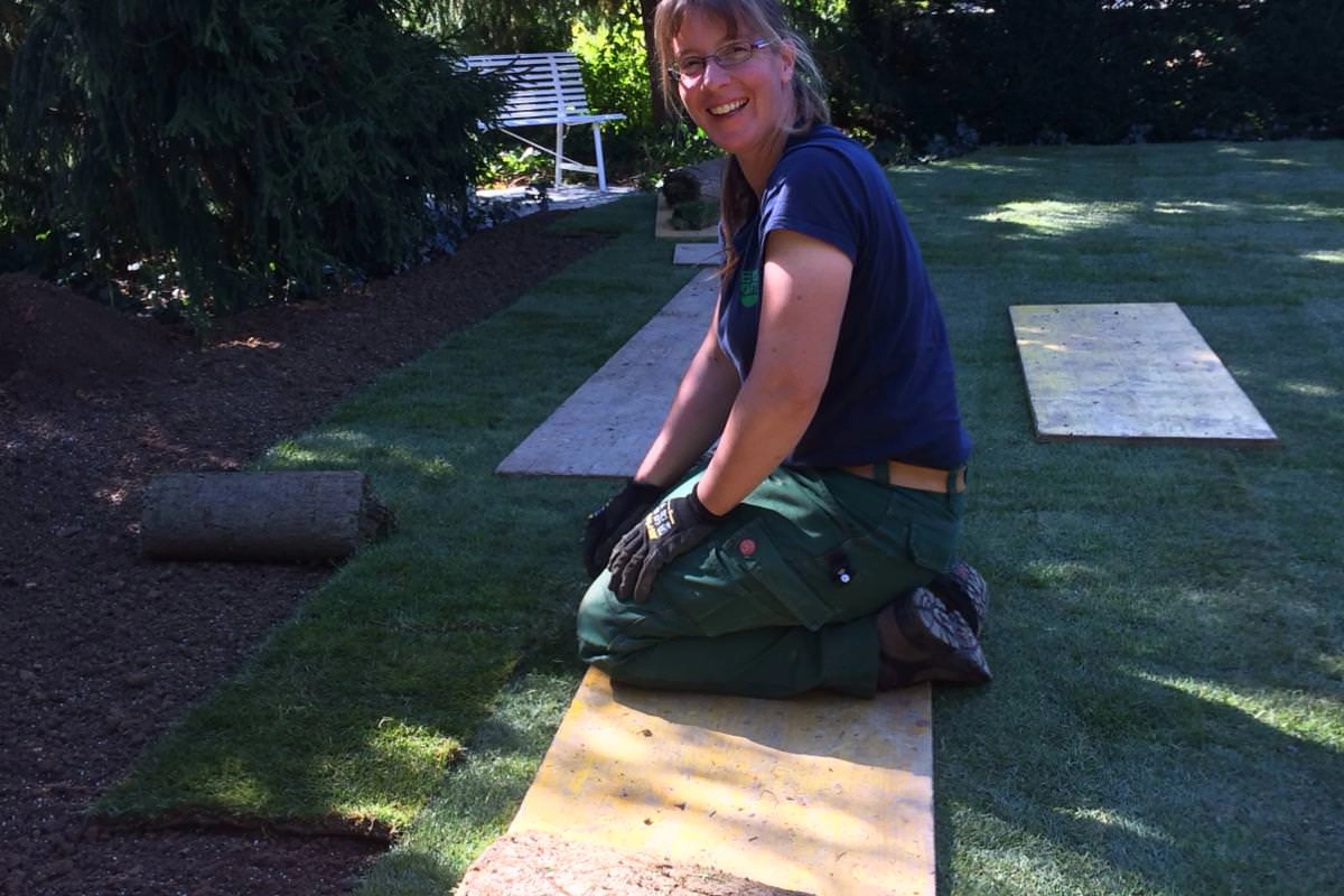 Terrainauffüllung, neuer Sitzplatz mit Zugangsstufen, Sichtschutzwände, Bepflanzung und Rollrasen: alles aus einer Hand!